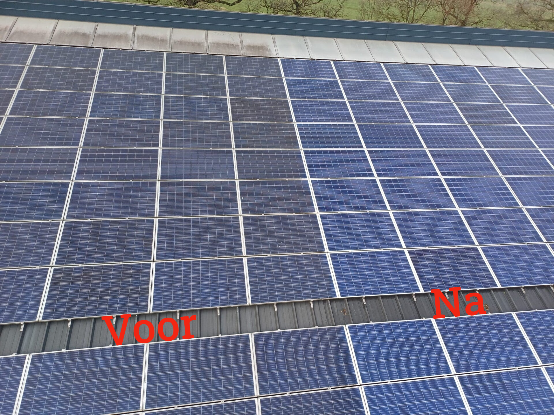 Bovenop de koeienstal mochten wij de zonnepanelen weer reinigen. Uiteraard namen we de lichtstraat ook mee.